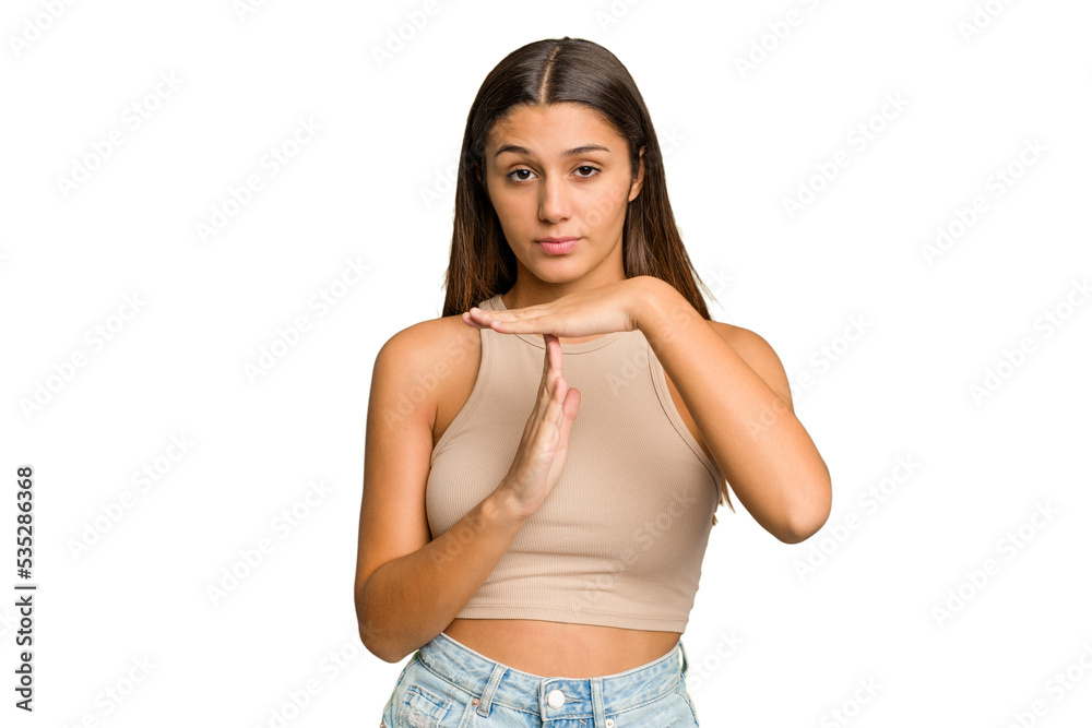 Young Indian woman isolated cutout removal background showing a timeout gesture.