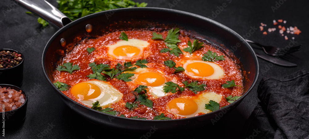 Shakshuka, a dish with fried eggs with tomato sauce, sweet pepper, garlic, onions, spices and herbs