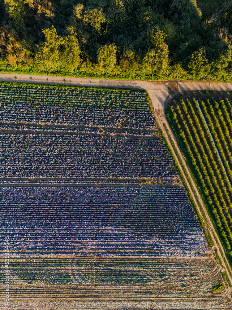 Upright aerial view of colorful fields, a dirt road and trees in autumn