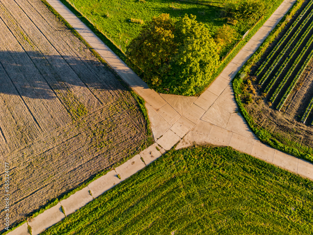 Concrete dirt roads meet between fields at a prominent tree in rural Germany seen by a drone