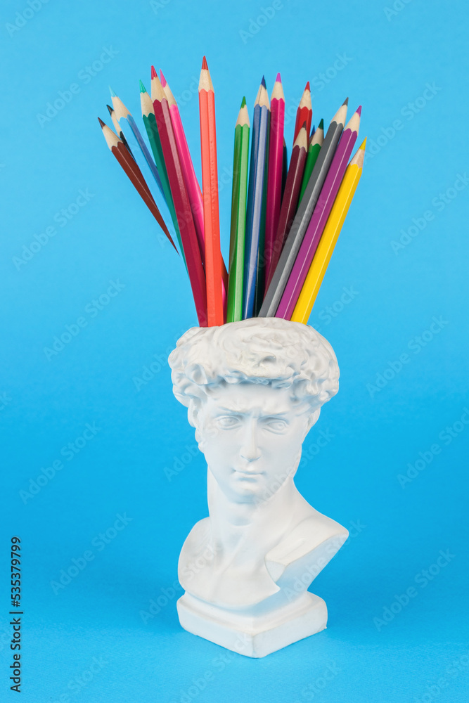 Plaster statuette with pencils in the head on a blue background. Minimal concept.