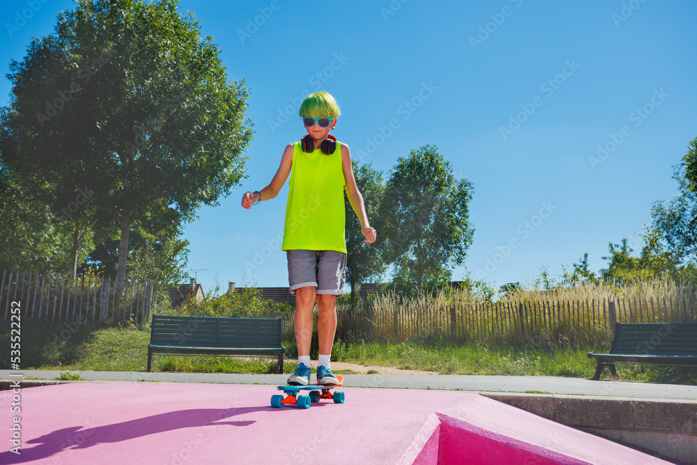 Boy with green hair ride skateboard at skatepark wear sunglasses