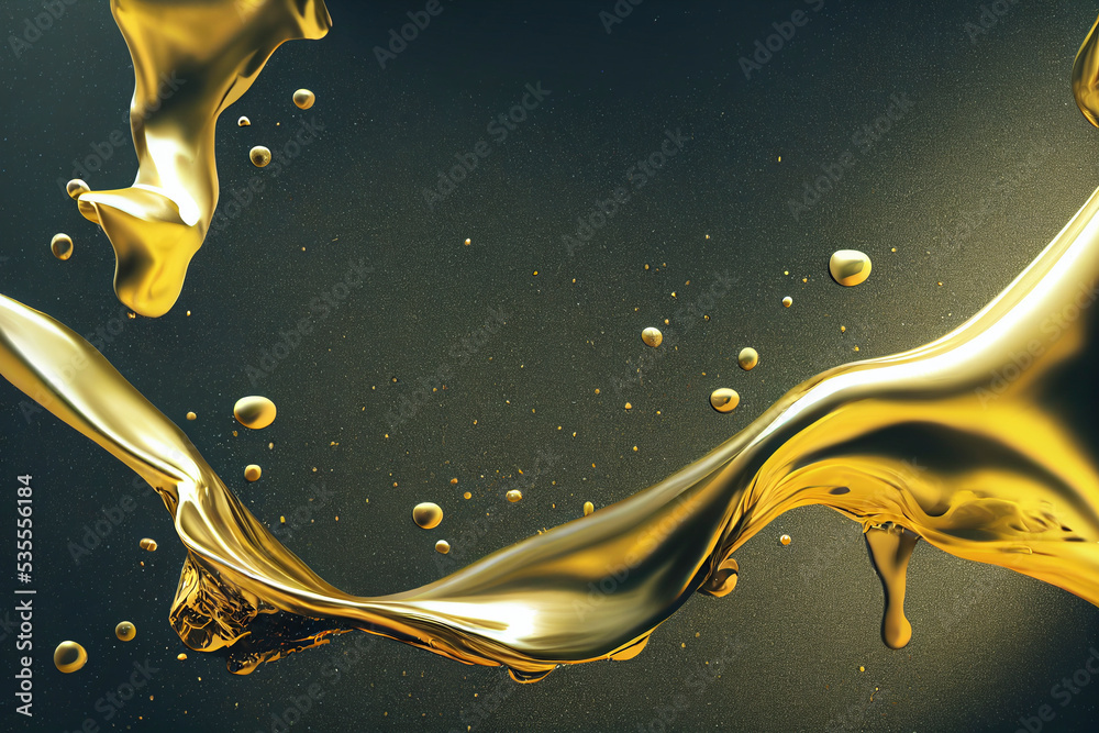 3D rendering, golden liquid, metallic moving liquid spray, heart shaped gel, golden splash clip art, artistic paint, abstract design elements isolated on black background. Luxury Beauty Concept