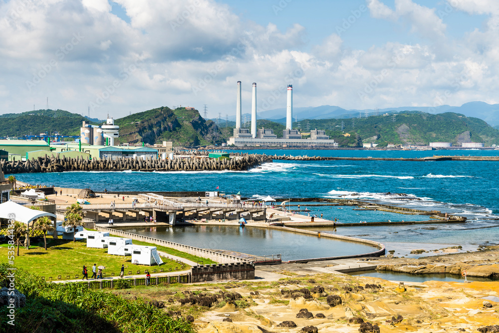 View of the coastal swimming pool at Heping Island Park in Keelung, Taiwan. Keelung Hsieh-ho Power Plant is just in the back.