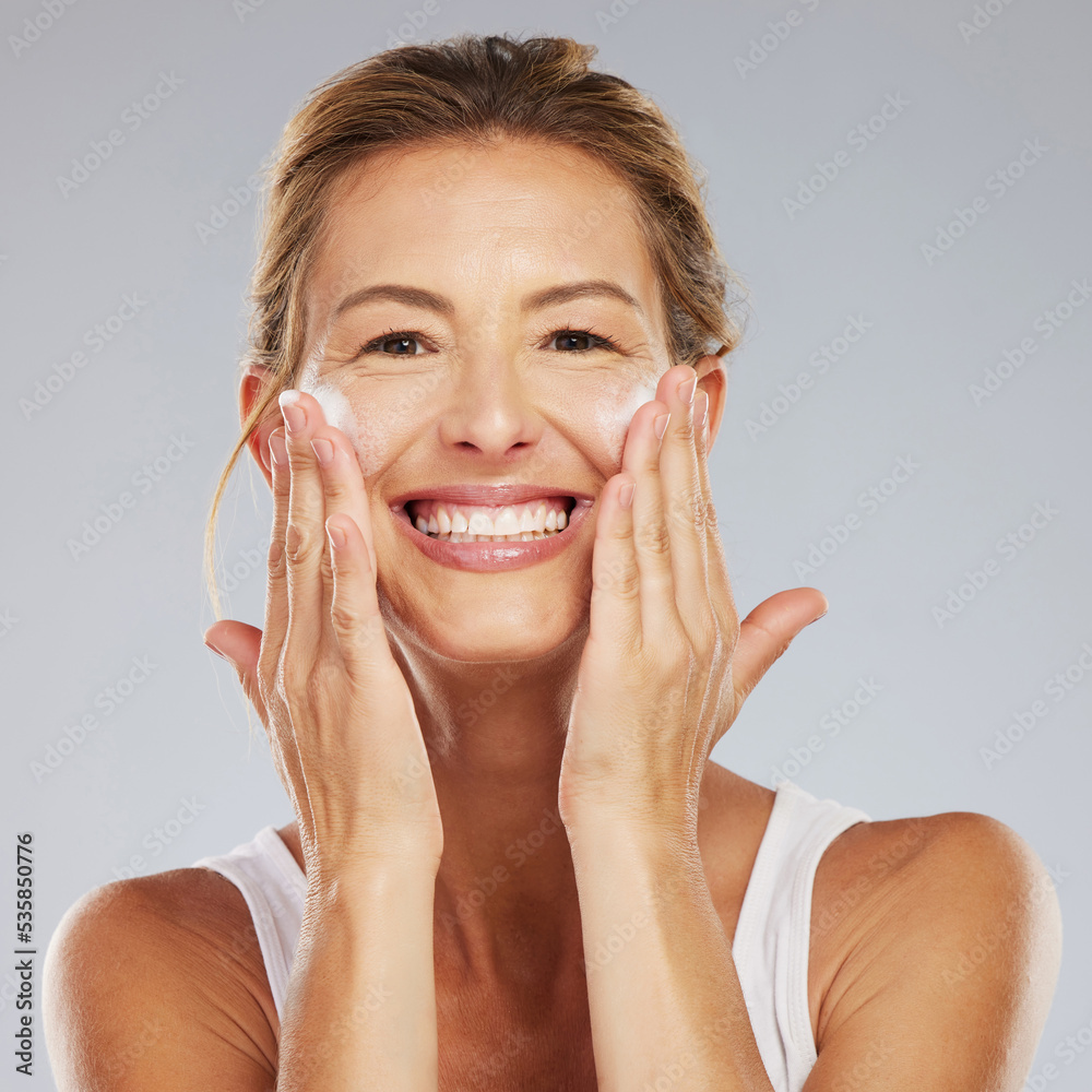 Mature beauty portrait, face wash and happy woman glowing skincare, dermatology and anti aging cosmetics on grey studio background. Happy Canada lady facial cleaning soap foam, wellness and selfcare