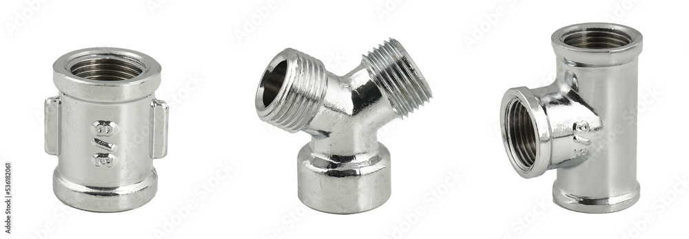 Many Chrome Plated Brass Ball Valves And Different Fittings, Isolated On White Background