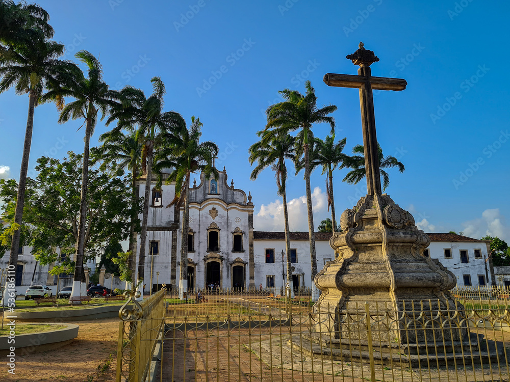 Centenary Portuguese colonial-style church next to palm trees and a cruise in the city of Goiana, northeast Brazil