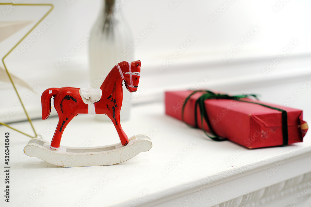 Christmas decor. A toy rocking horse stands on a white elegant shelf