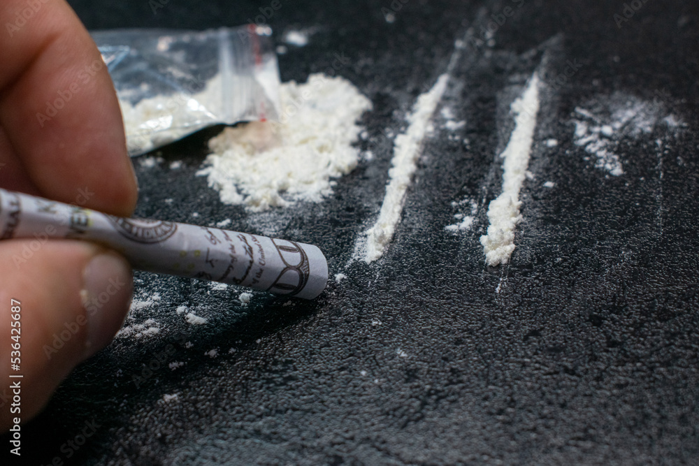 Use from a plastic bag of cocaine through a breathing tube from a hundred dollar bill, on a black background, closeup.