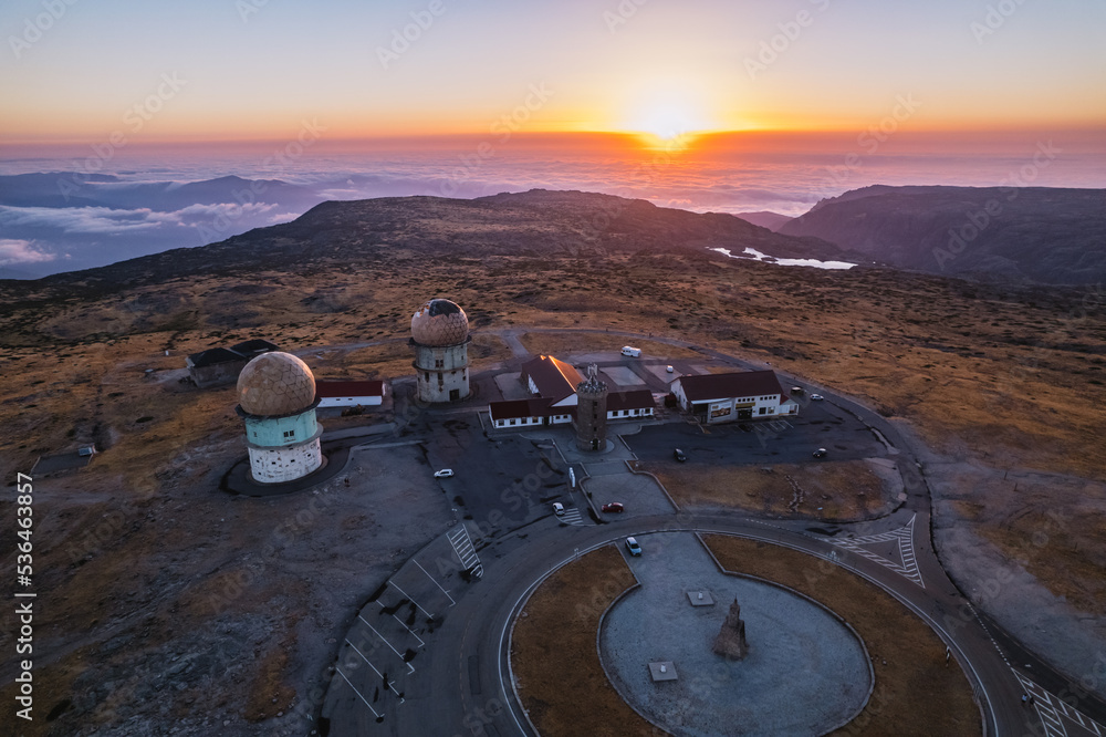 Aerial shot of Torre observatory on Serra da Estrela, in Portugal. Radar station.