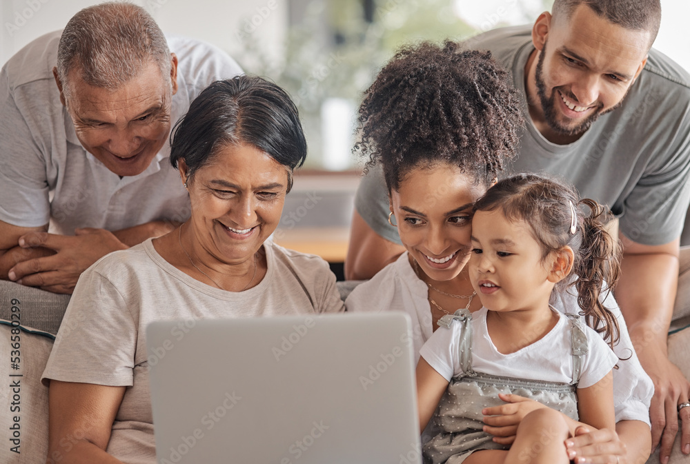 Family laptop, child internet and grandparents watching funny video with children on the sofa in home living room and happy with comedy film. Girl streaming show with parents and senior people