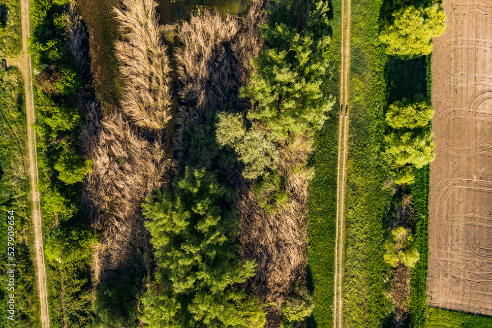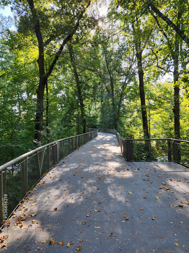 a gorgeous autumn landscape in the garden along a smooth footpath on a bridge with fallen autumn leaves surrounded by lush green trees at Atlanta Botanical Garden in Atlanta Georgia USA