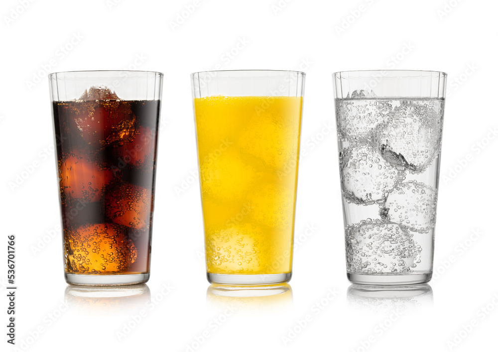 Cola soda drink with lemonade and orange soda with ice cubes and bubbles on white background.