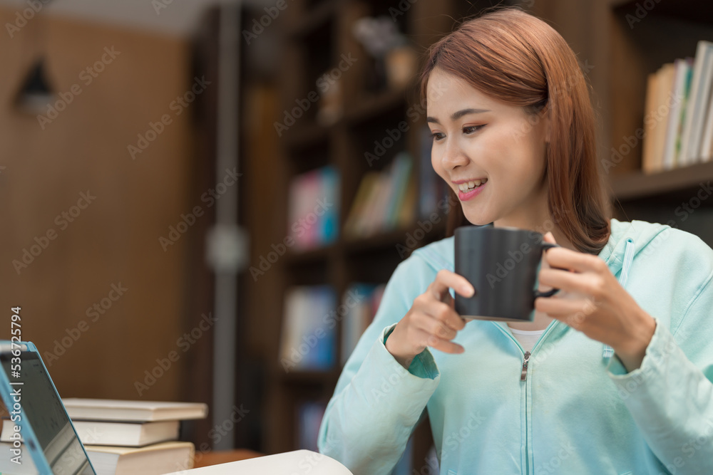 Education concept, Teenage girl watching video math tutorial on tablet and drinking hot chocolate
