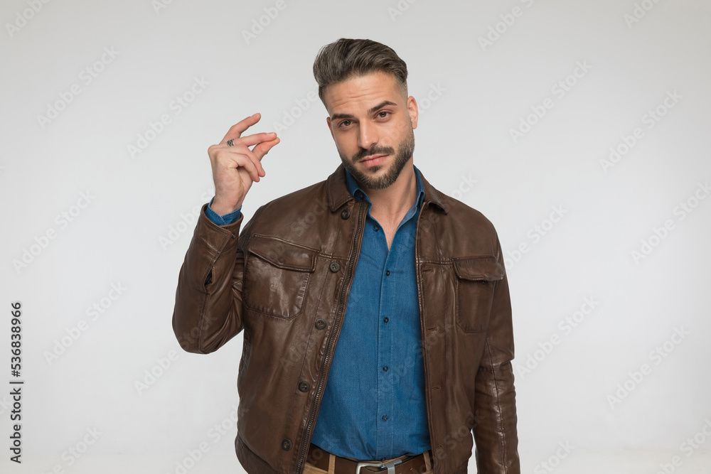 sexy man in casual outfit holding arm in the air and snapping fingers