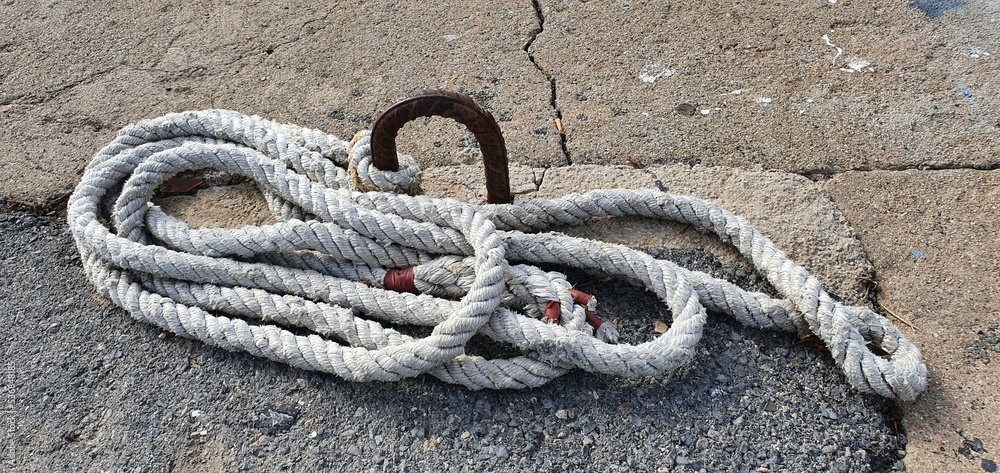 Old white rope on the pier. Marine rope. The old rope lies on the pavement. Tied rope.