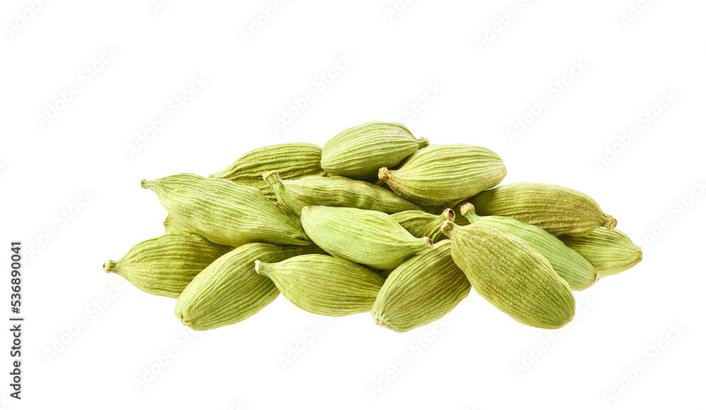 Pile green cardamom pods isolated on white background.