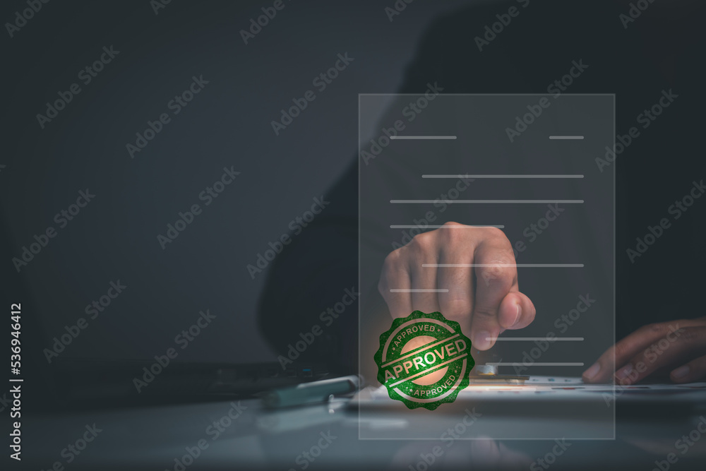 Business approved concept. Manager hand stamping with approved stamp on certificate document public paper, investment certificate, business document, certificate approved, investment allowed.
