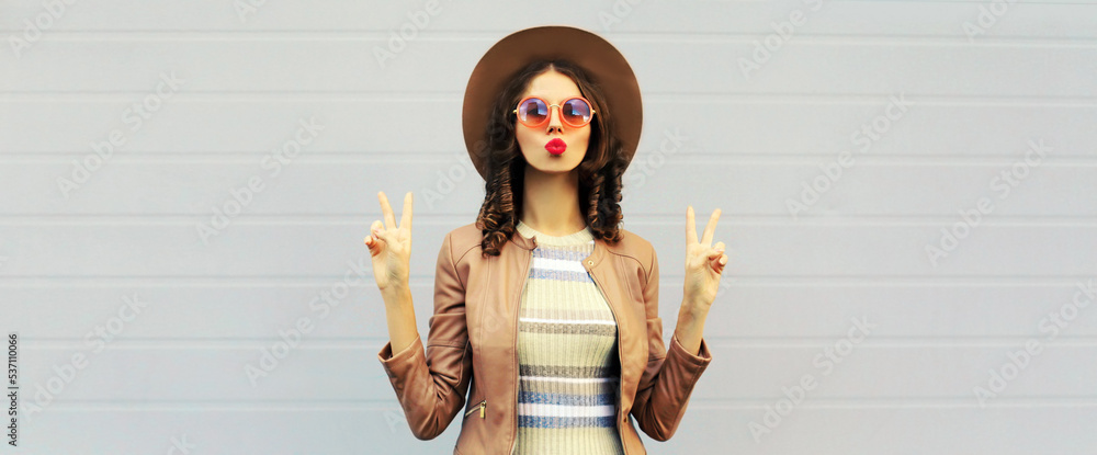Portrait of beautiful young woman blowing her lips sending air kiss wearing knitted dress, jacket, round hat on city street background