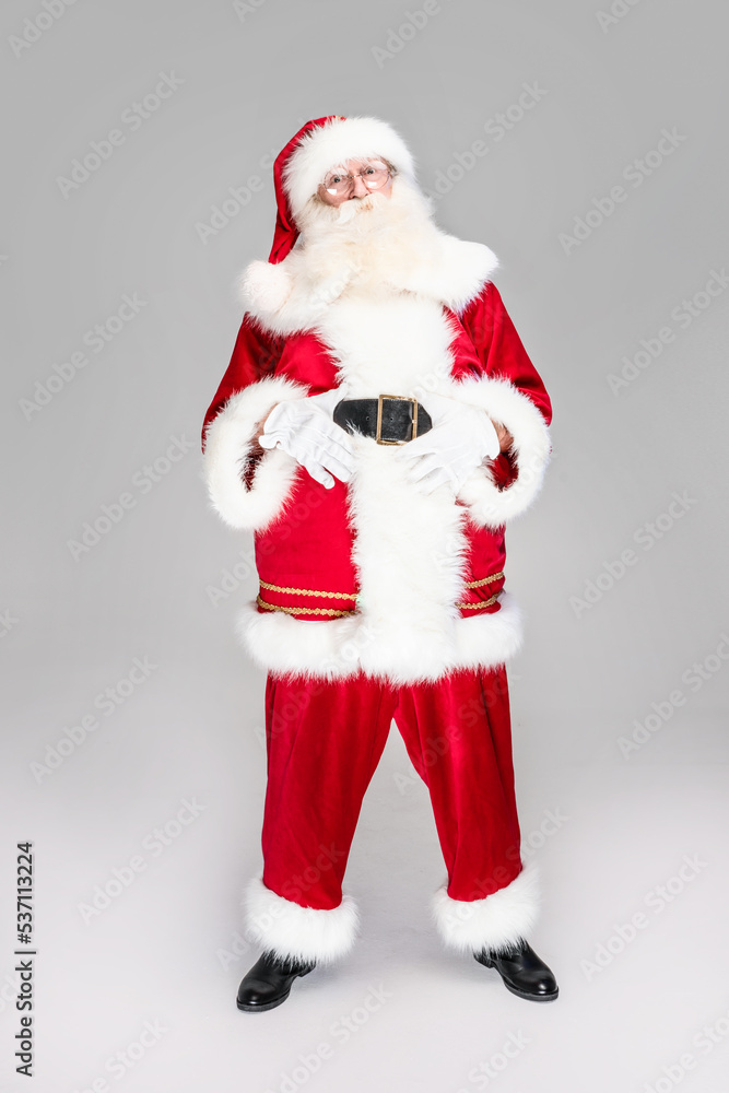 Hungry Santa Claus is ready for all the xmas cookies. Merry Christmas and Happy New Year. A lot of copy space on the light gray studio background.