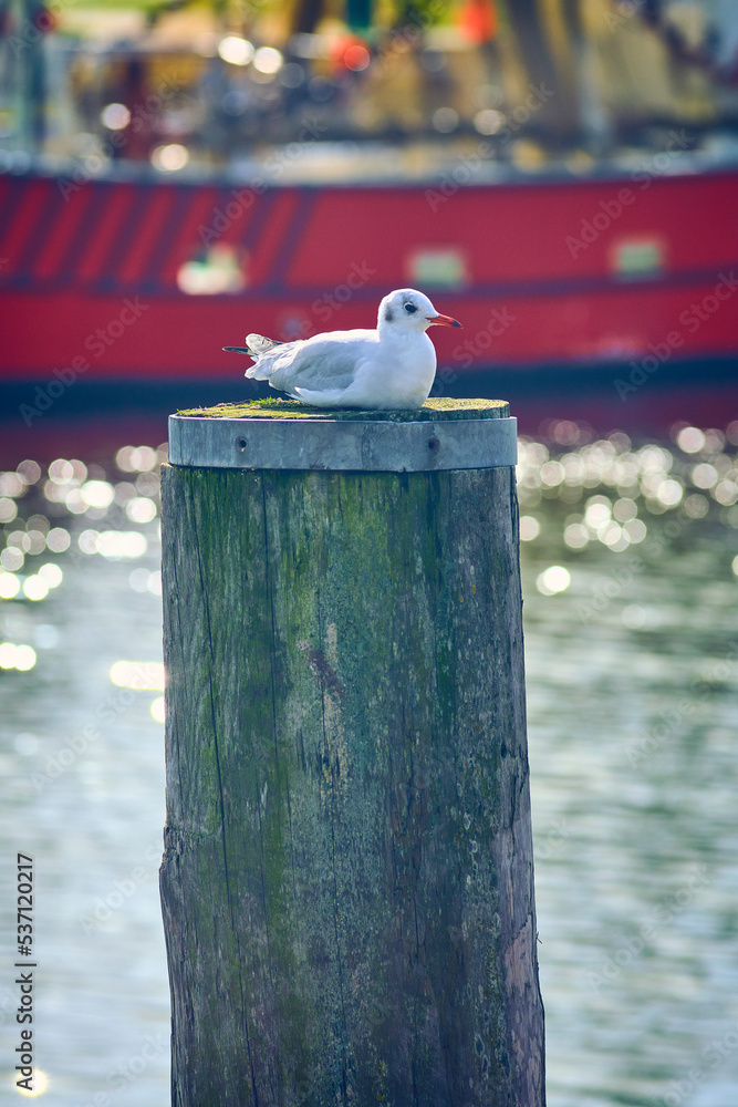 Seagull sitting on pole in Harbor. High quality photo