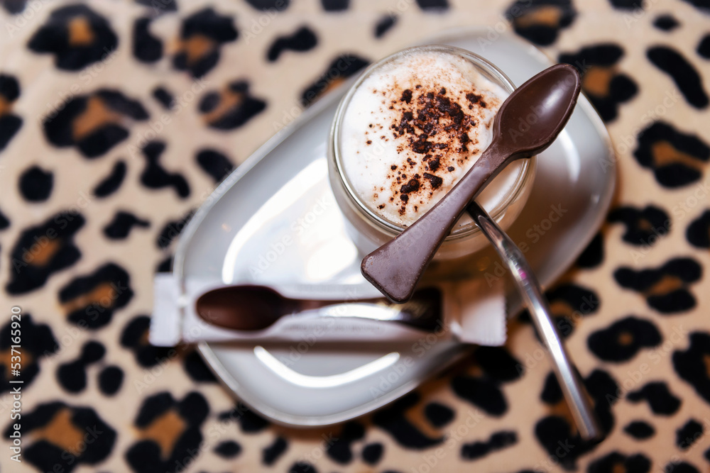 cappuccino coffee with milk foam and a chocolate spoon on a table with leopard print, concept of coffee shop and barista art.