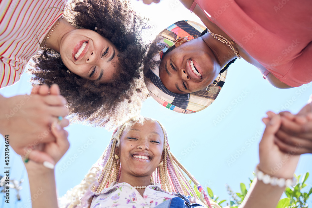 Girl, friends and circle below holding hands together for solidarity, trust and happiness. Black woman, group and huddle with smile, unity and face look on face together for fun, vacation or holiday