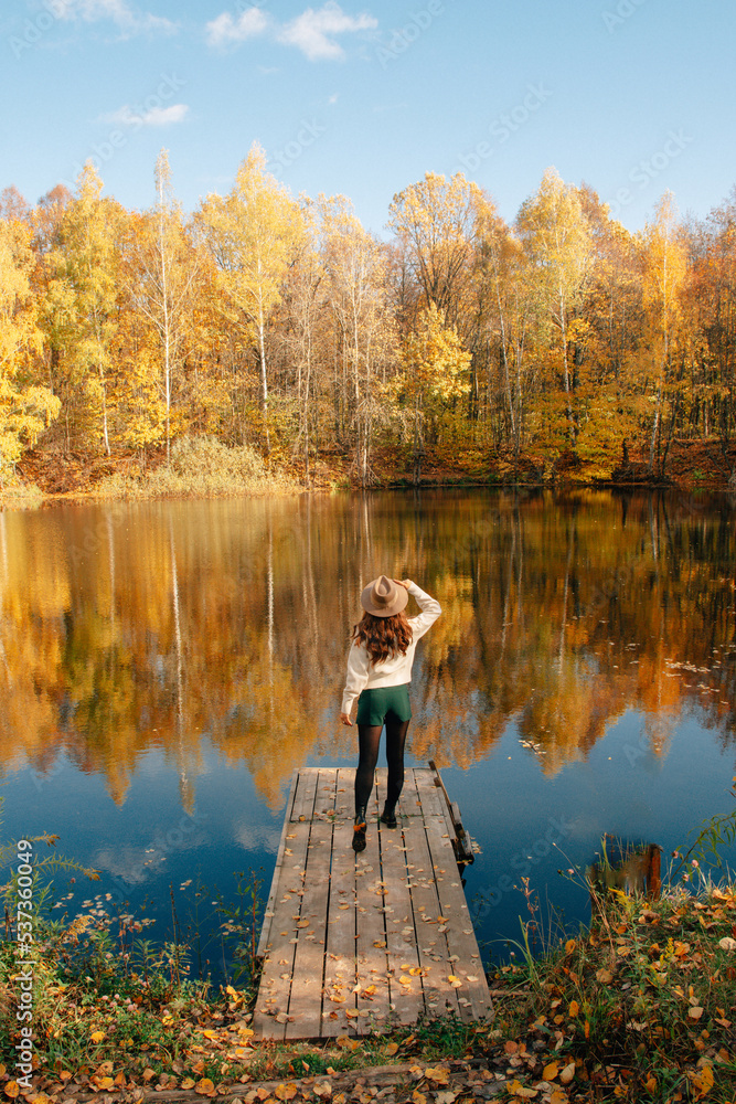 A young girl in a hat stands on a bridge near a pond in an autumn landscape