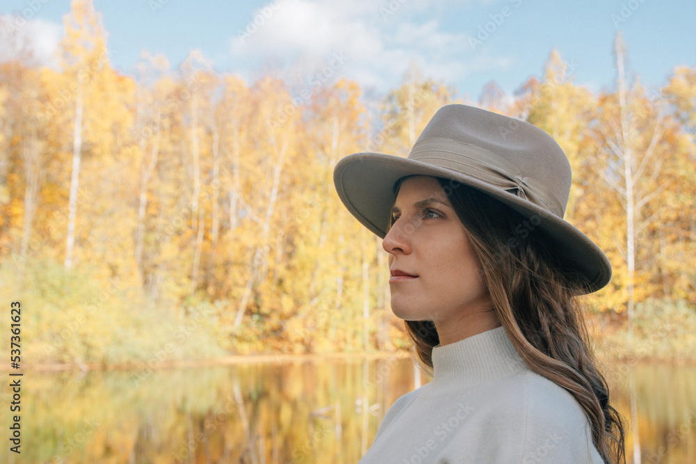 portrait in profile of a young brunette girl in a beige hat against the background of an autumn forest