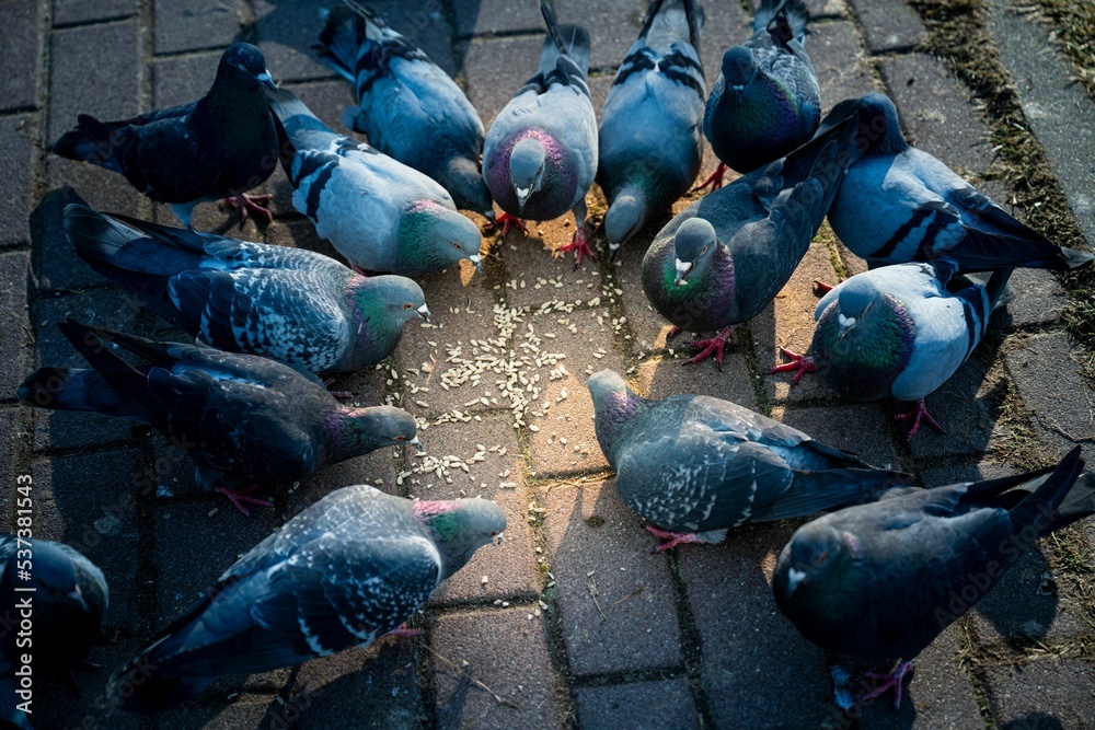 Closeup shot of a group of pigeons eating corn