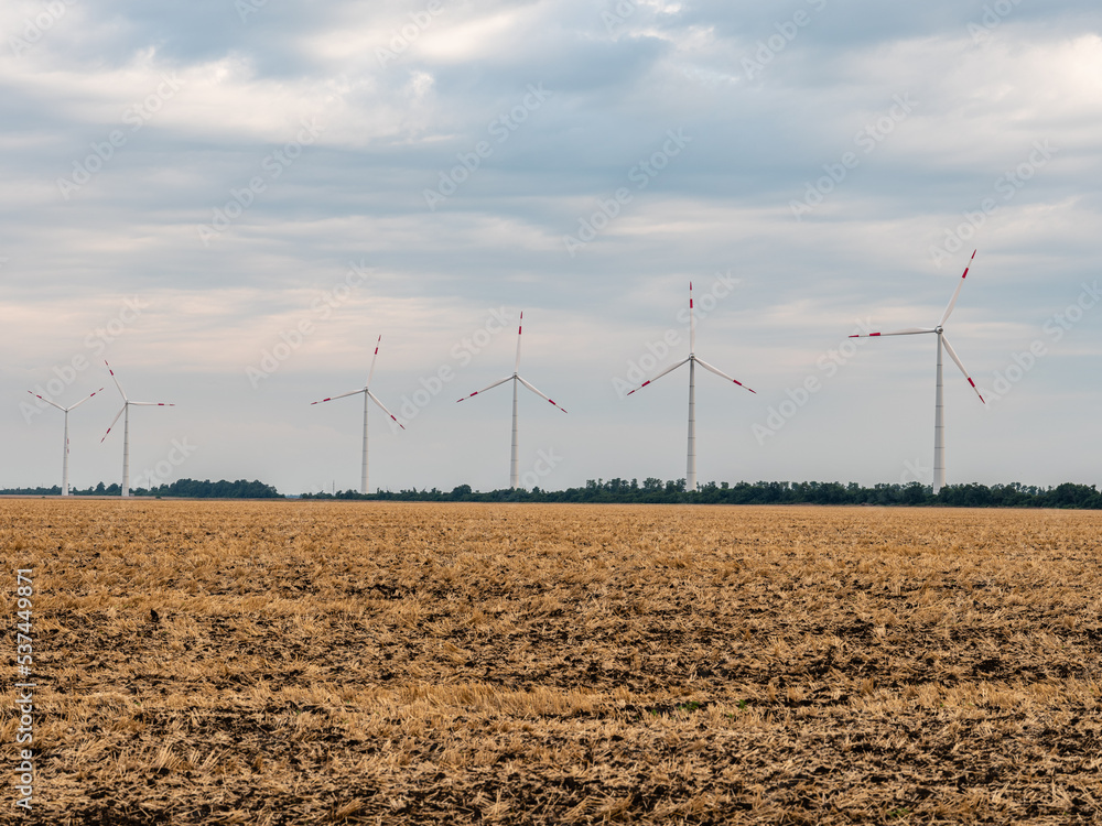 A row of windmills (wind turbines with rotating blades) against the backdrop of autumn field. Adyghe wind farm from many towers of wind turbines. Wind power complex of Rosatom.