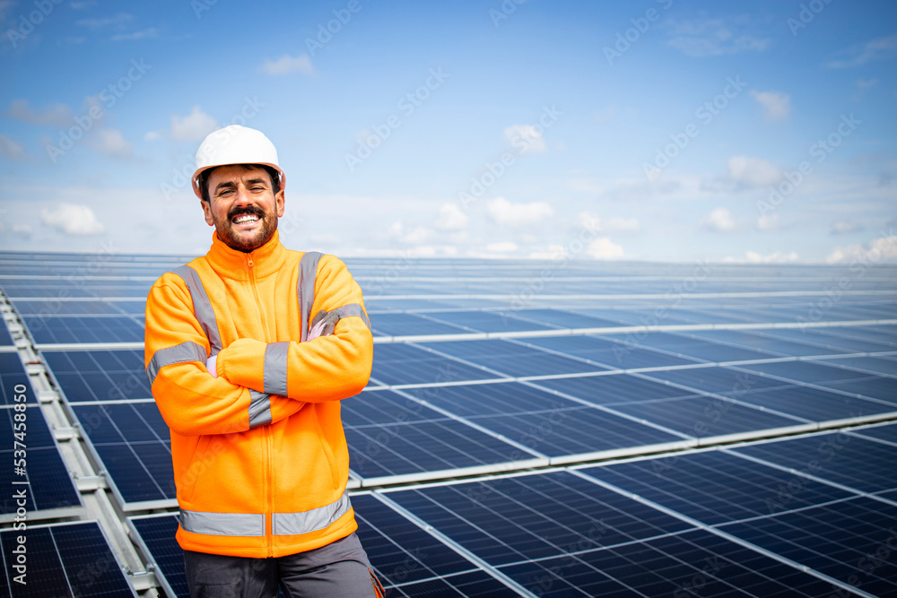 Portrait of smiling worker with arms crossed proudly standing on the rooftop after successful installation of solar panels. Sustainable and renewable energy production.