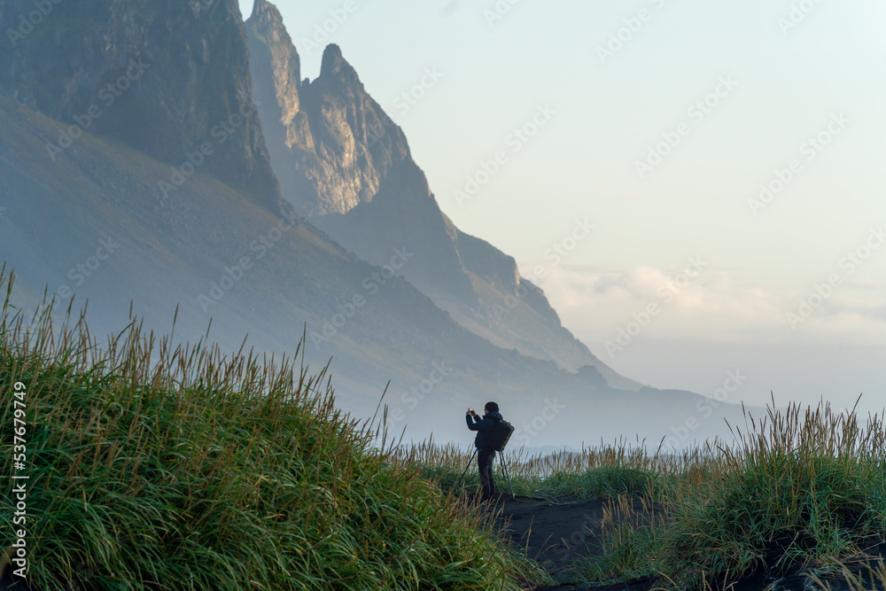 hiking in the mountains at sunset with photographic model. Black sand beach with vegetation