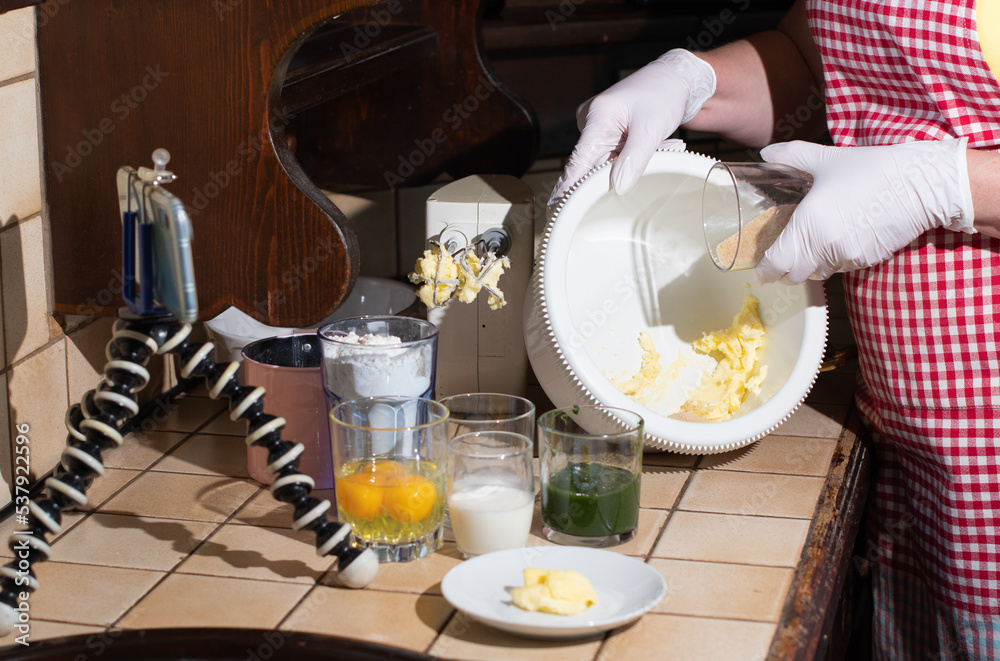 woman cooking spinach muffin step by step, pouring sugar into a bowl