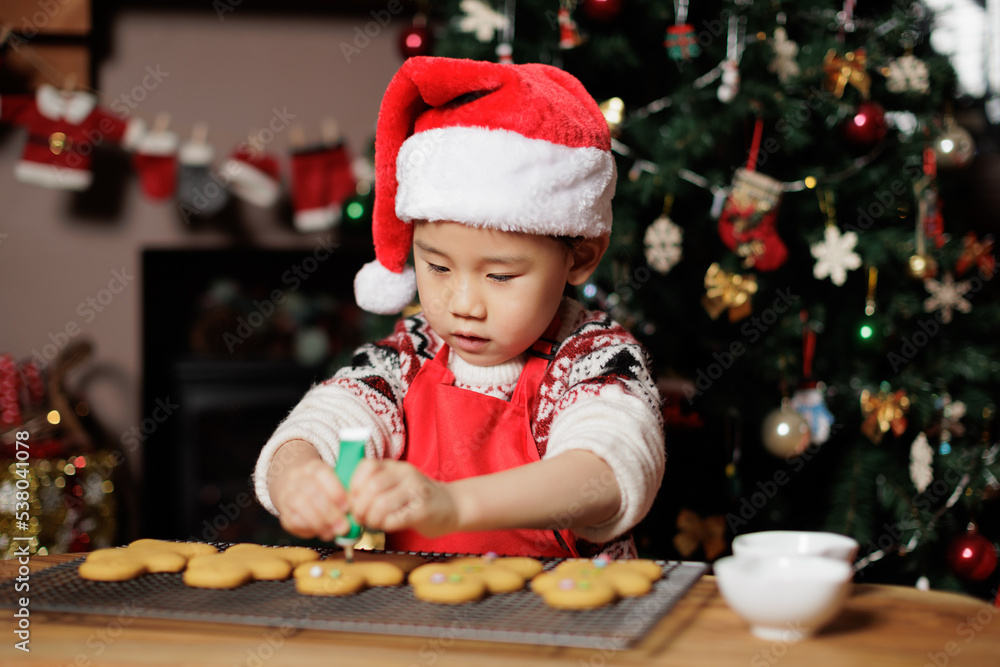 young girl making gingerbread man for celebrating Christmas at home