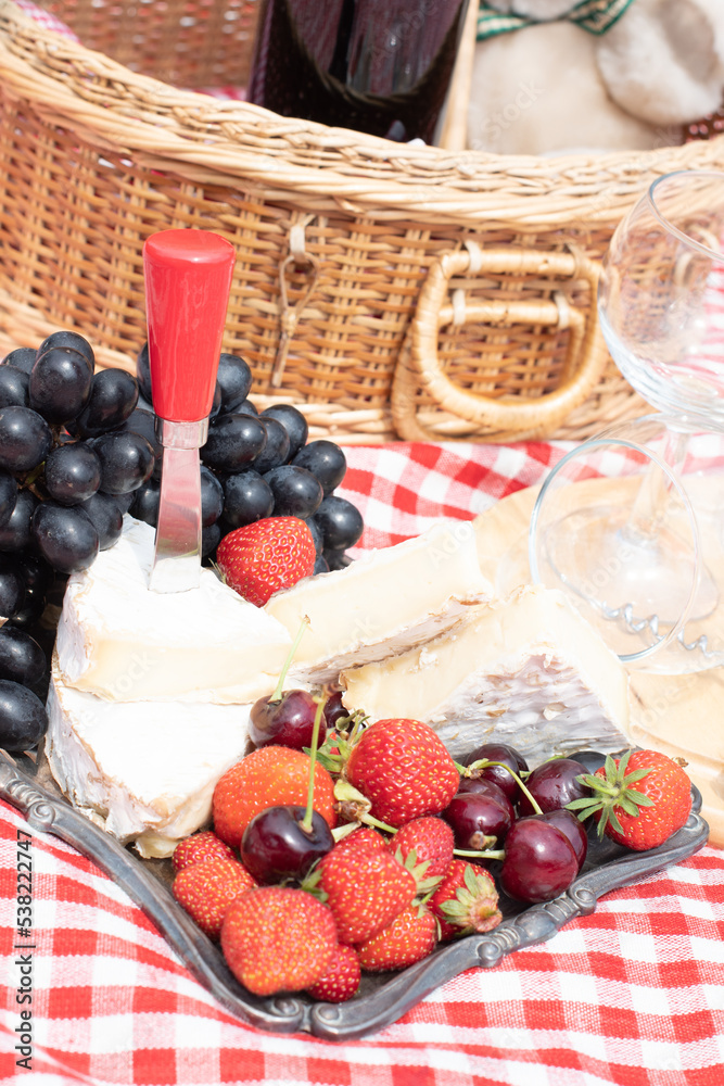 summer picnic on a green lawn with red wine, cheese and fresh berries, grapes