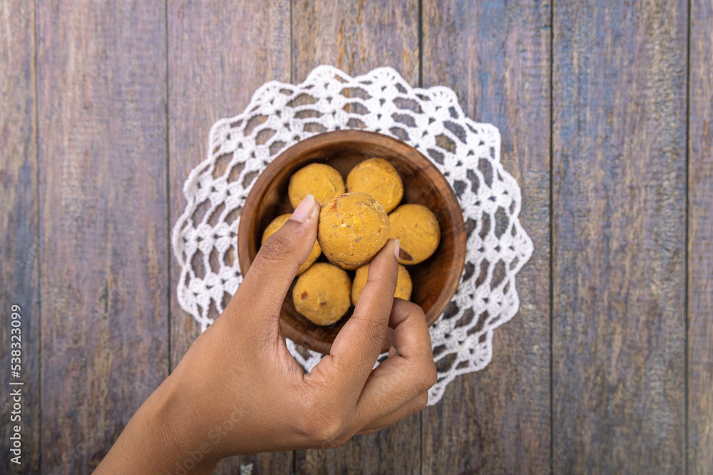 A girl picking up Chana Ladoo or chickpea flour laddu is a special sweet made with dry chana, sugar, and ghee, high in protein and gluten-free