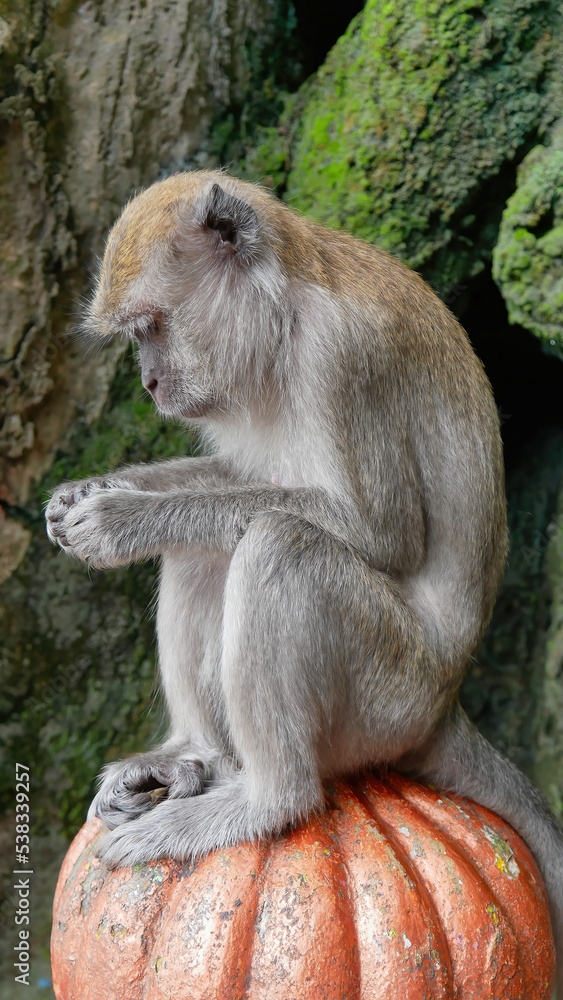 Close-up photo of a monkey at the entrance of Batu Caves temple in Kuala Lumpur, Malaysia