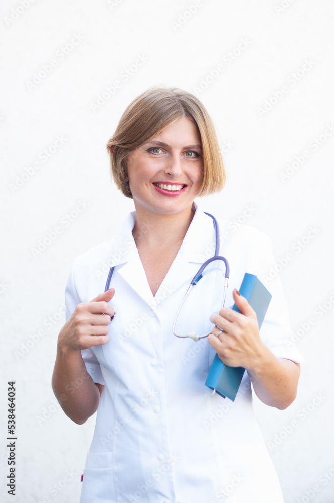 Young beautiful caucasian woman doctor with a phonendoscope on her neck