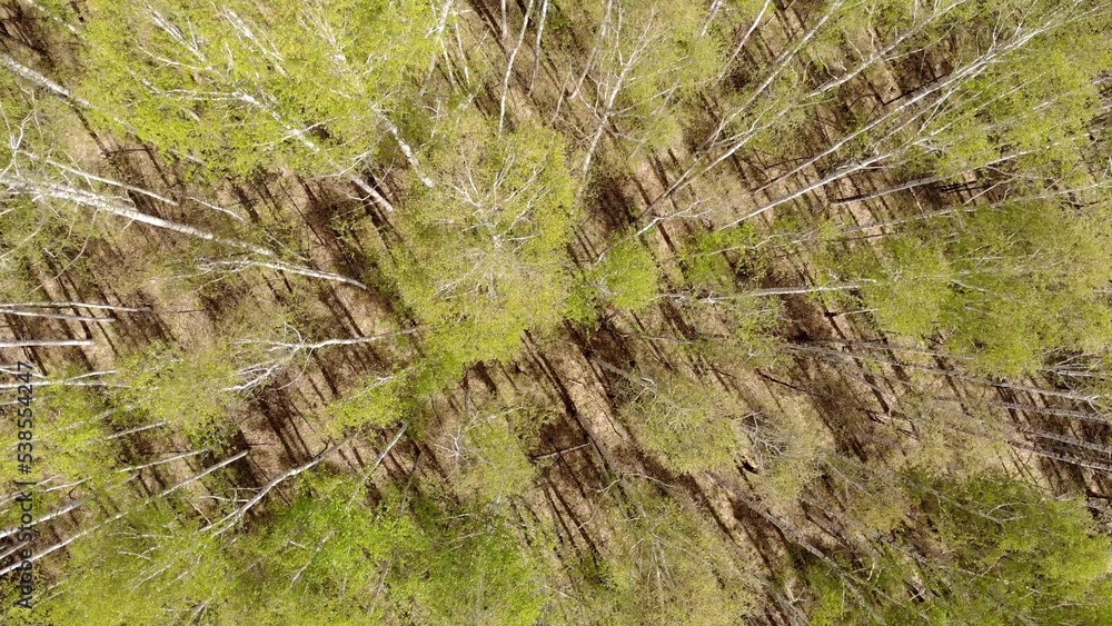 Forest from a bird's eye view. Slender tall trees. Forest expanses.
