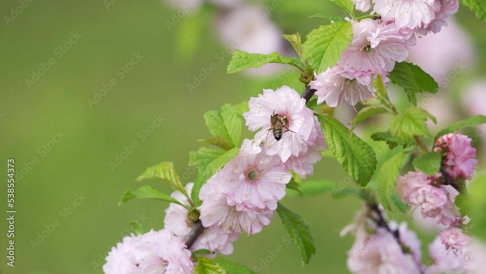 Pink almond flowers close up. The bee collects pollen from pink flowers. Almond blossoms on a warm spring day.