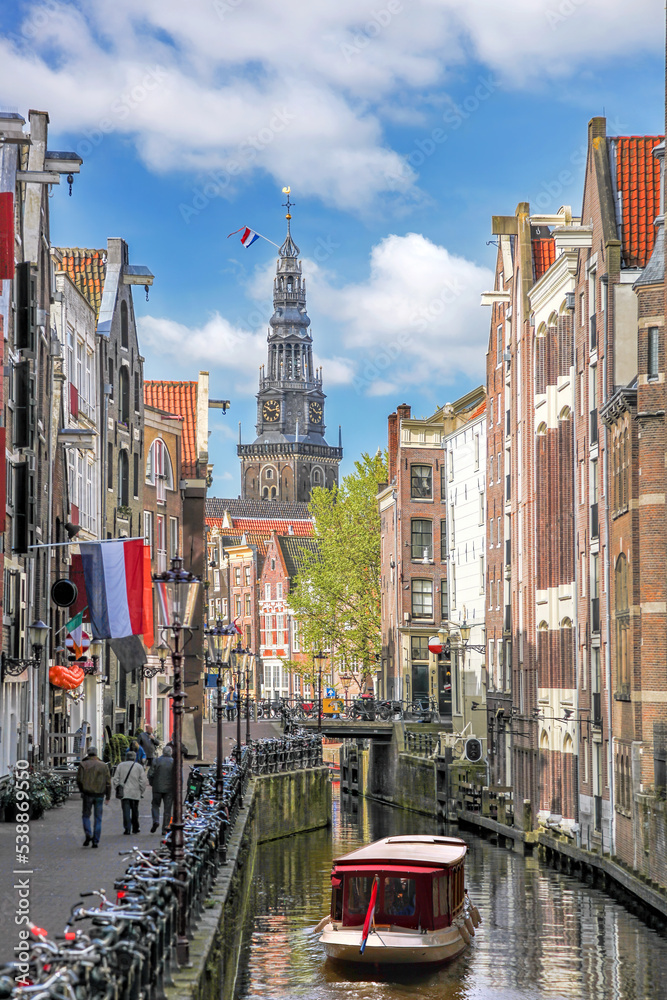 Traditional old buildings and houseboat on canal in Amsterdam, Netherlands