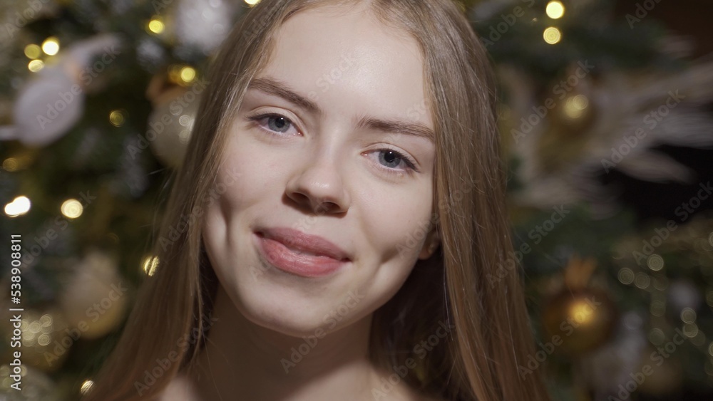 new year portrait of a woman smiling on the background of a Christmas tree. girl with Christmas mood and beautiful wreath