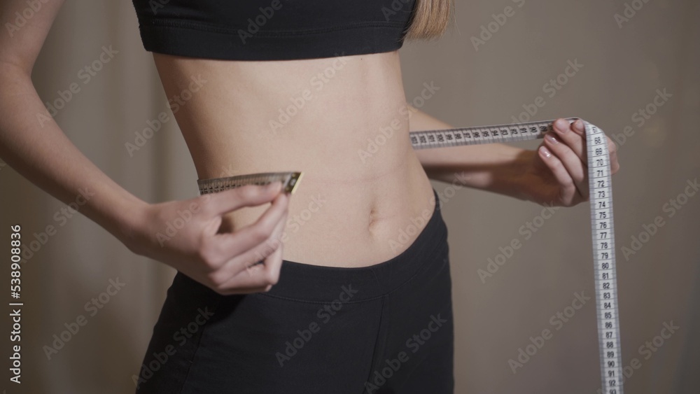 Side view of young woman measuring her waist with measure tape