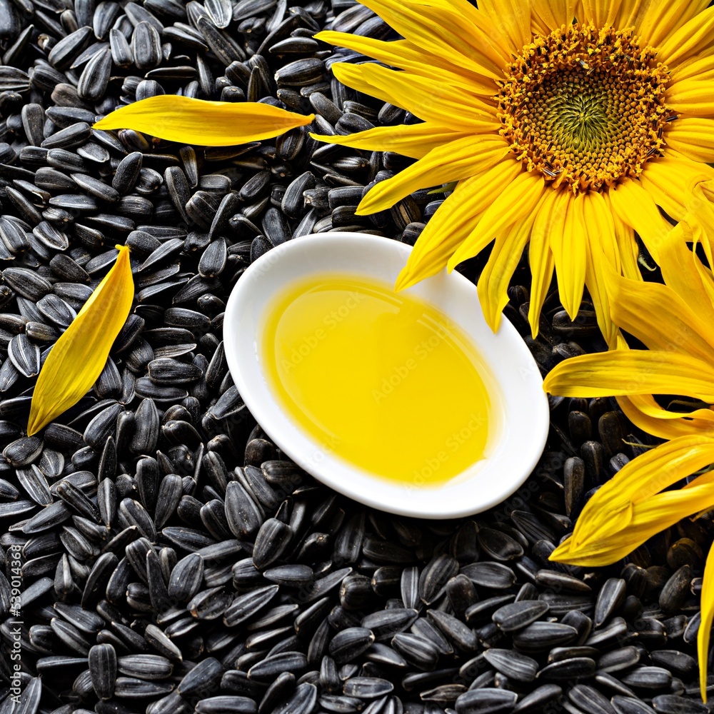 Fresh sunflower flower on a background of black seeds with a bowl of sunflower oil, vegetable oil by cold pressing. The concept of vegetable fats.