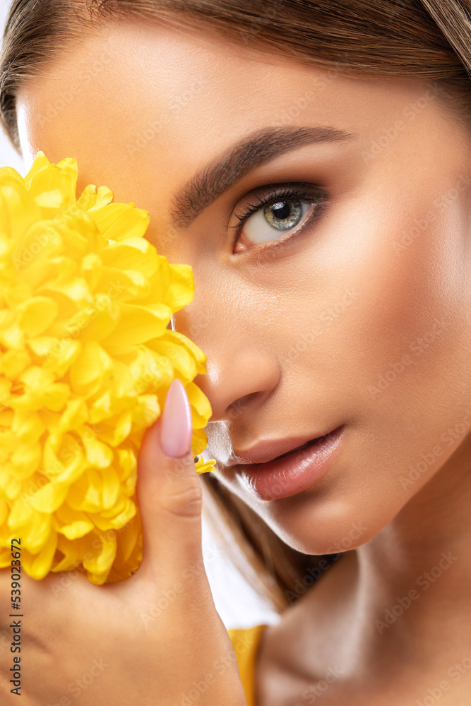 Portrait of an attractive girl with healthy clean skin and beautiful makeup, she is holding a yellow chrysanthemum. Aesthetic cosmetology and make-up concept.