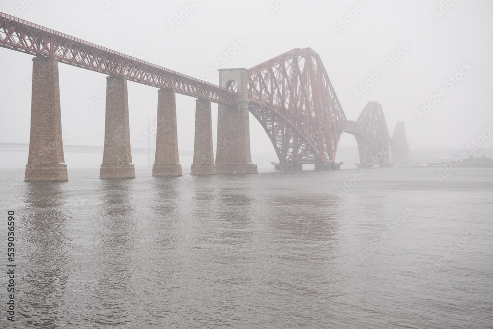 View of the George IV Bridge Rail Bridge from South Queensferry across the water of the Firth of Forth during a snow blizzard in a Winter day in Edinburgh, Scotland, UK, under low visibility