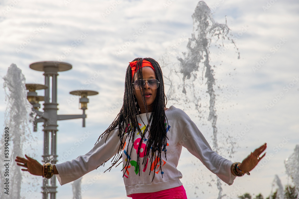 an African American woman with long sisterlocks wearing white and pink clothes, sunglasses and an orange head scarf holding dancing in front of a water fountain with lush green trees