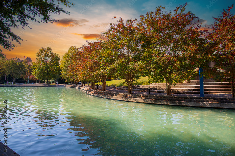 a stunning autumn landscape at World's Fair Park with a pool with blue water surrounded by red and yellow autumn trees and lush green trees and plants with powerful clouds at sunset in Knoxville