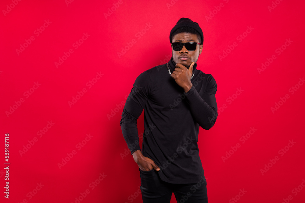 Portrait of attractive serious guy touching chin making decision wearing black look isolated over bright red color background